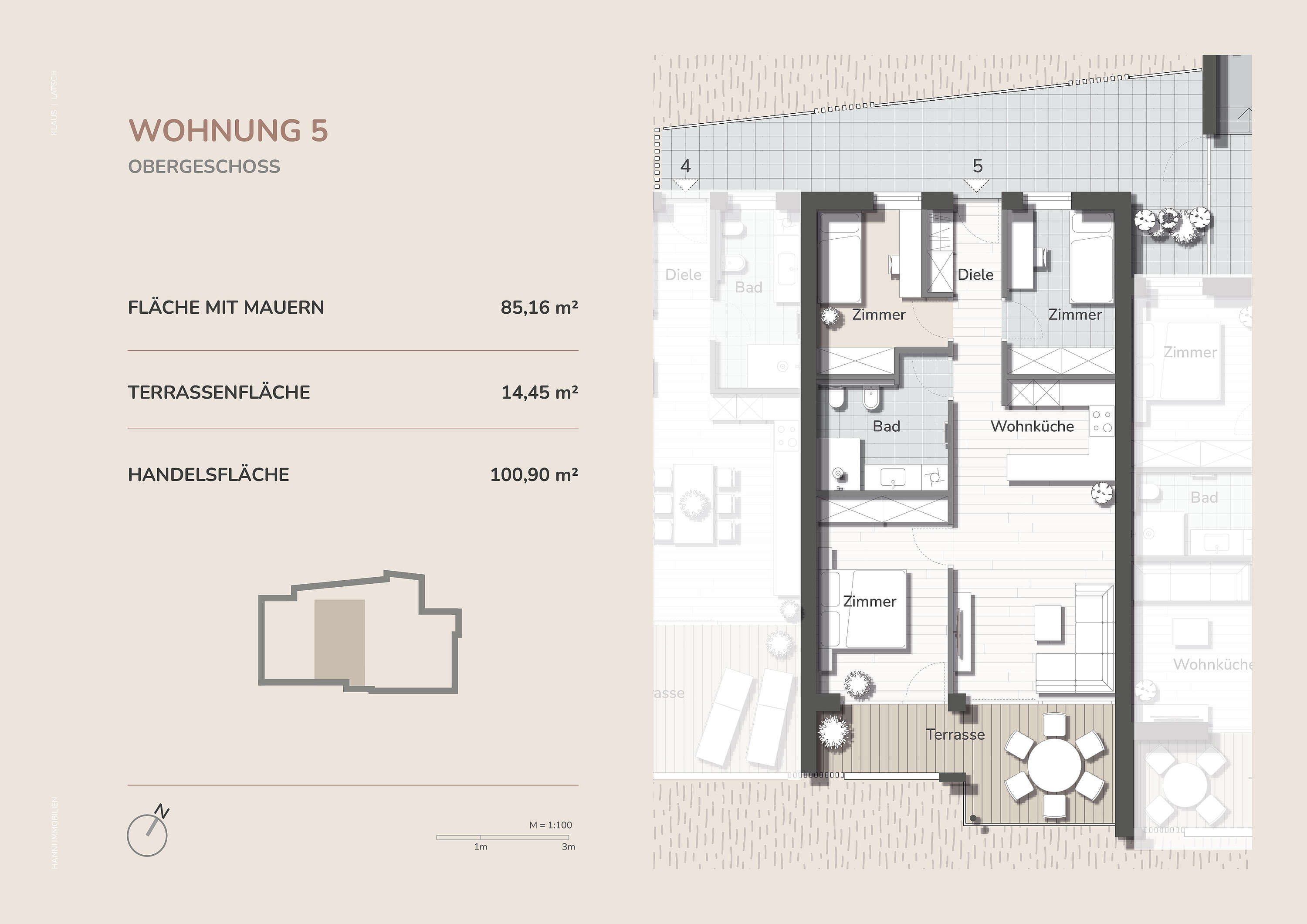 Alle Wohnungen überzeugen durch eine optimale Südausrichtung mit sonnigen Südterrassen, die zusätzlichen Wohnraum im Freien bieten und einen freien Blick auf die umliegende Berglandschaft ermöglichen.