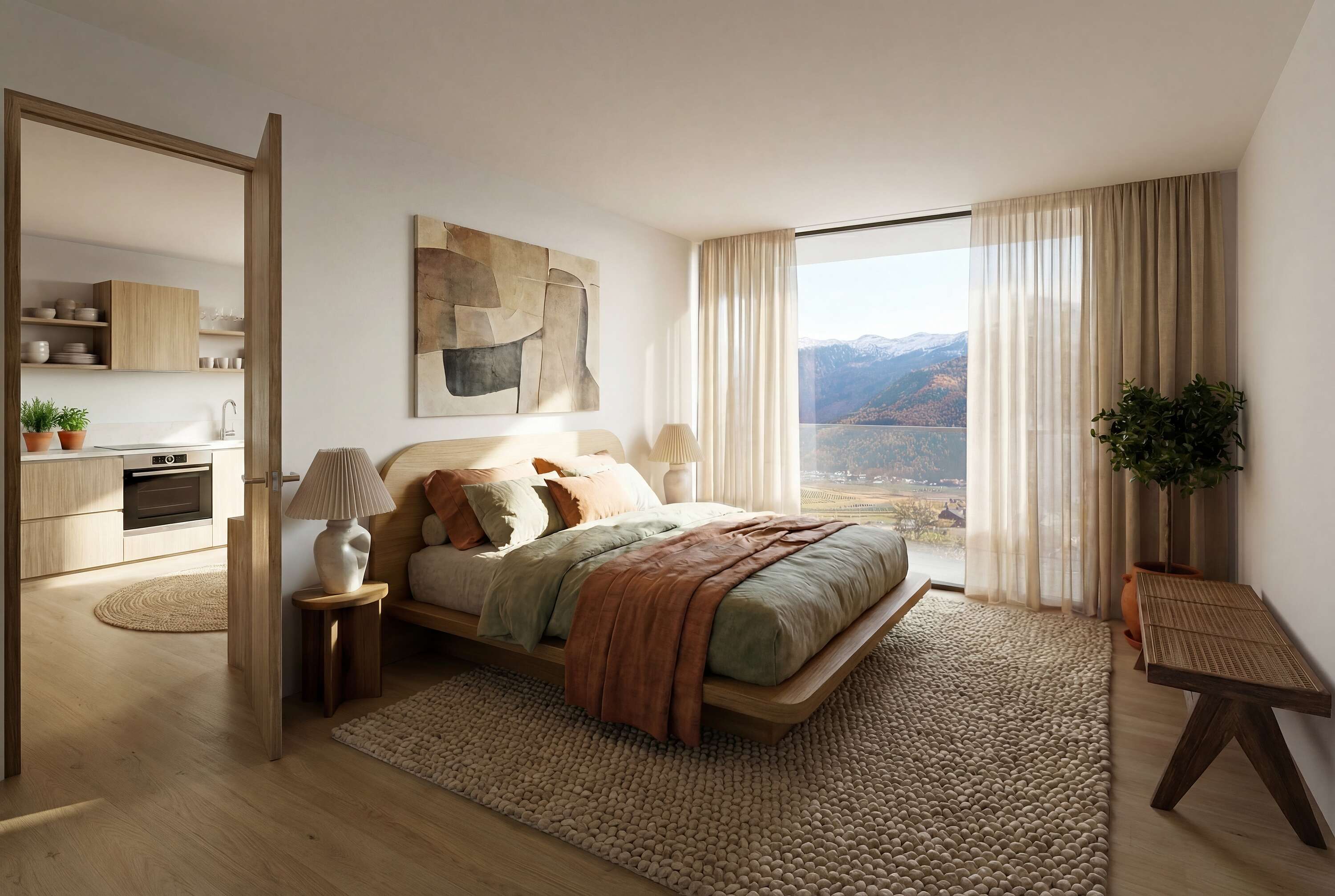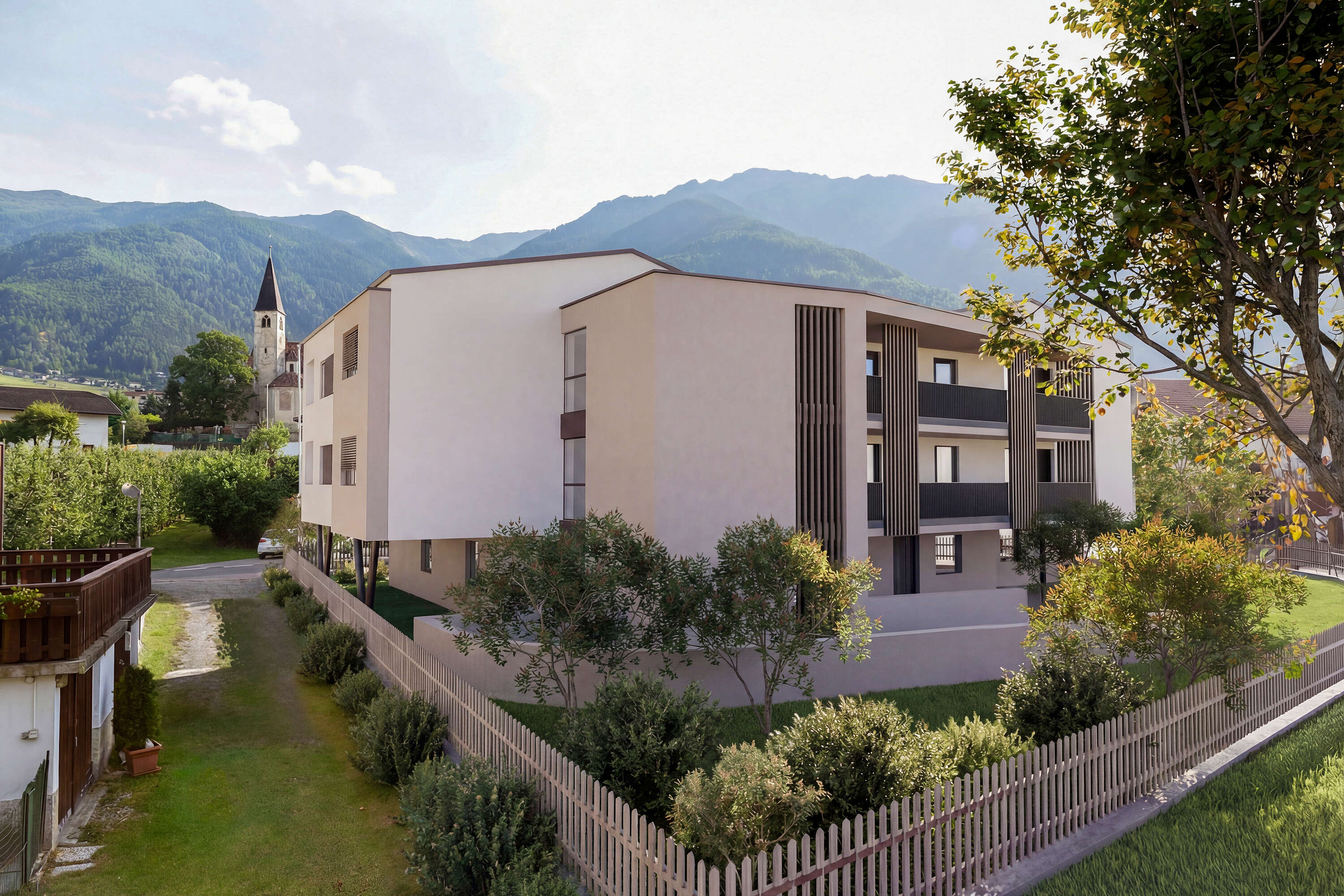 Alle Wohnungen überzeugen durch eine optimale Südausrichtung mit sonnigen Südterrassen, die zusätzlichen Wohnraum im Freien bieten und einen freien Blick auf die umliegende Berglandschaft ermöglichen.